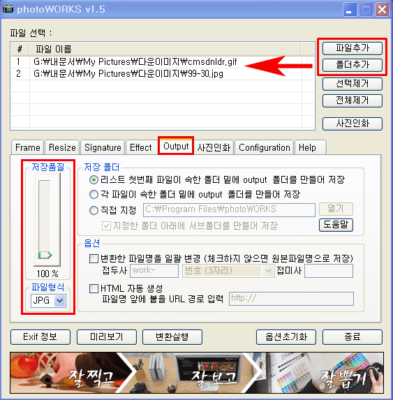 - 저장품질은 90 ~ 100%, 파일형식은 JPG로 맞춥니다.
