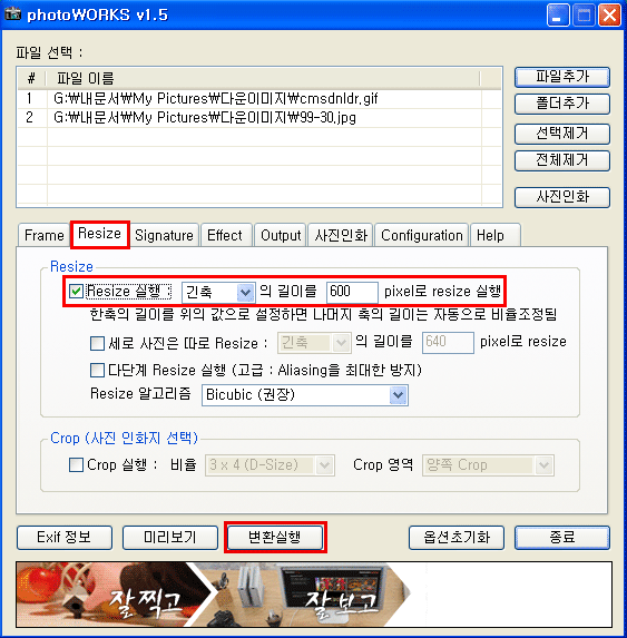 ※ 다단계 리사이즈 실행 박스에 체크를 하면 이미지 변환이 조금 느릴 수는 있으나 이미지는 좀더 선명하게 얻을 수 있는 장점이 있음.